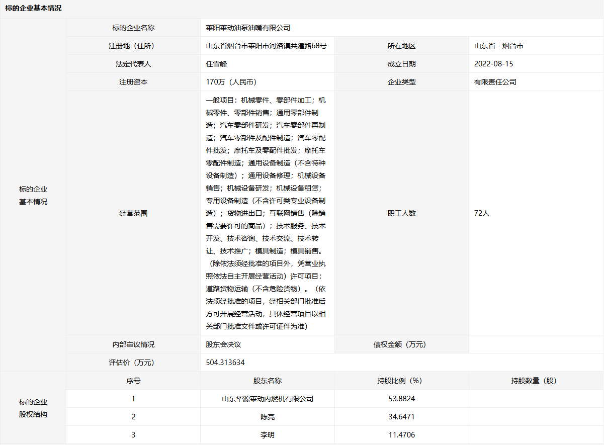 萊陽萊動油泵油嘴有限公司53.8824%股權(quán)