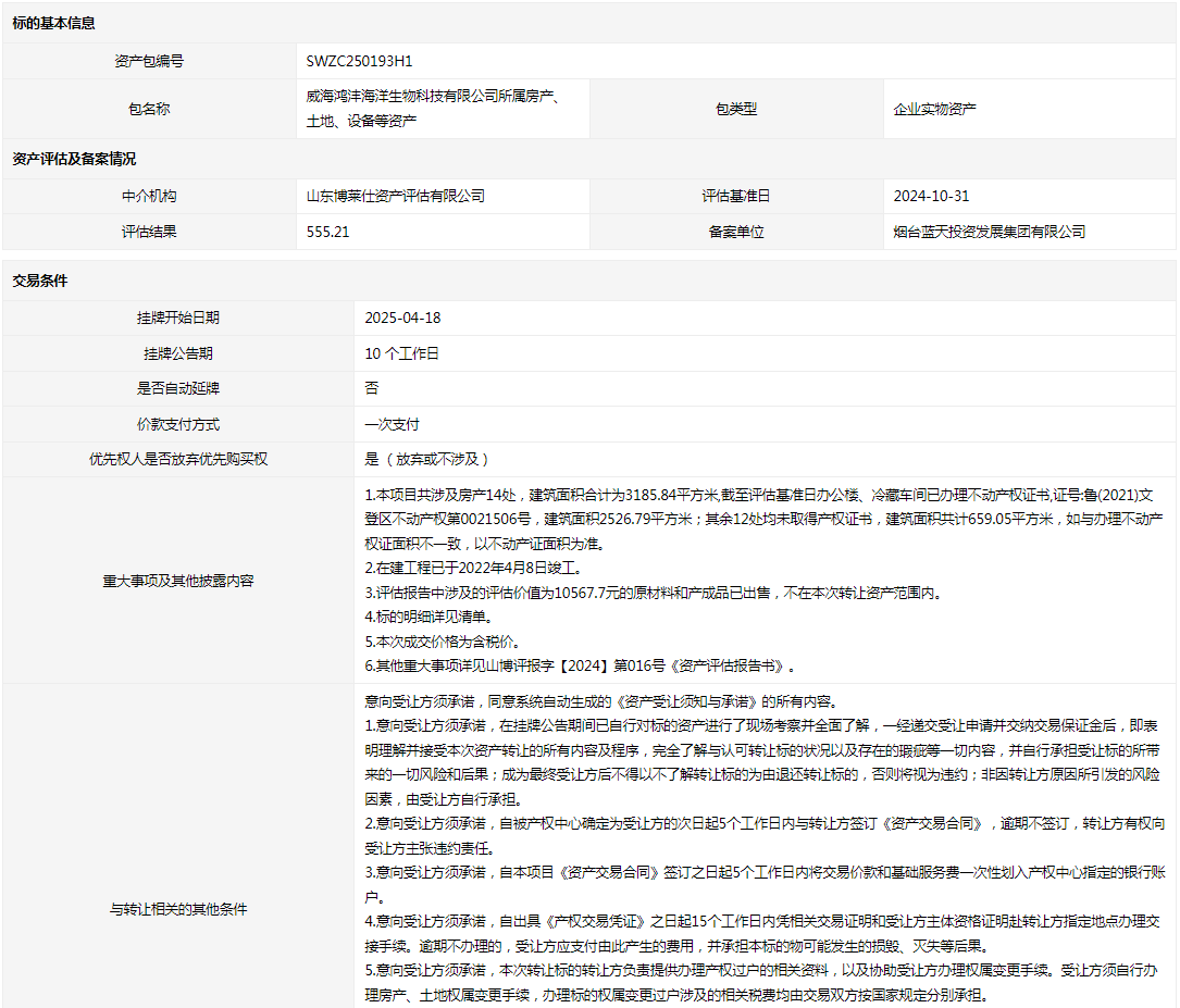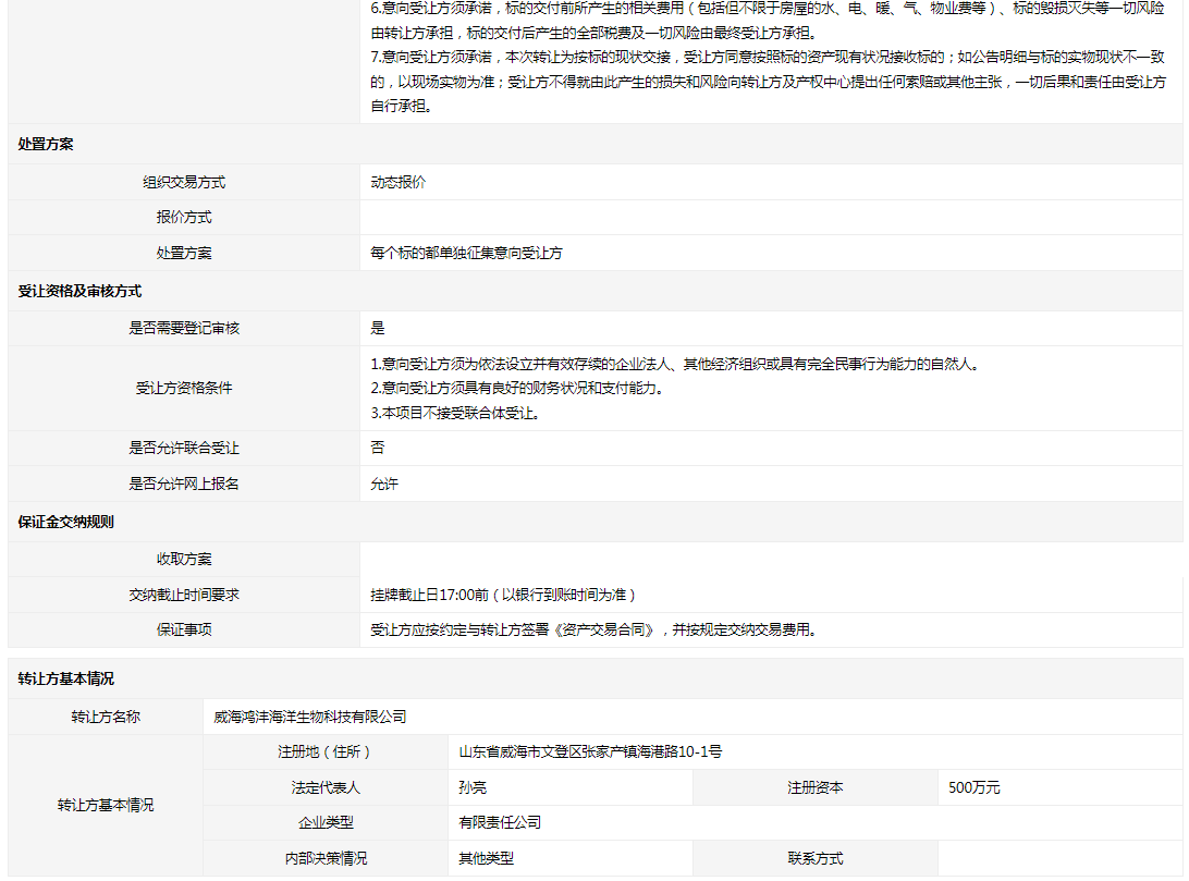 • 轉(zhuǎn)讓方:威海鴻灃海洋生物科技有限公司