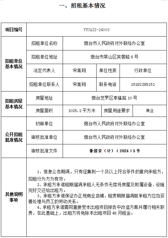 煙臺市南大街267號一樓東側門頭房招租公告